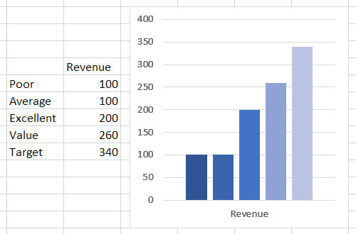 As mentioned earlier, there are actually three components of a bullet chart. Before going ahead to create one, you need to group the information at hand into these three levels. With the information at hand, you need to create a table that contains all the information in an appropriate manner or format data series which includes the values.