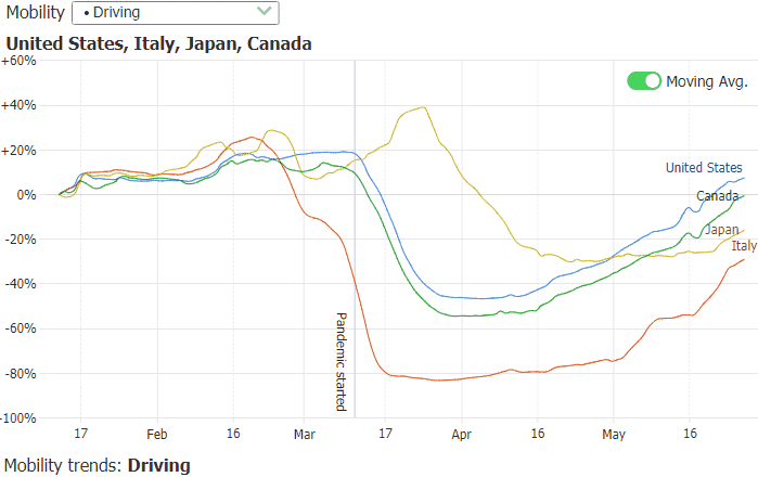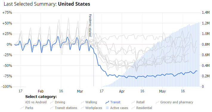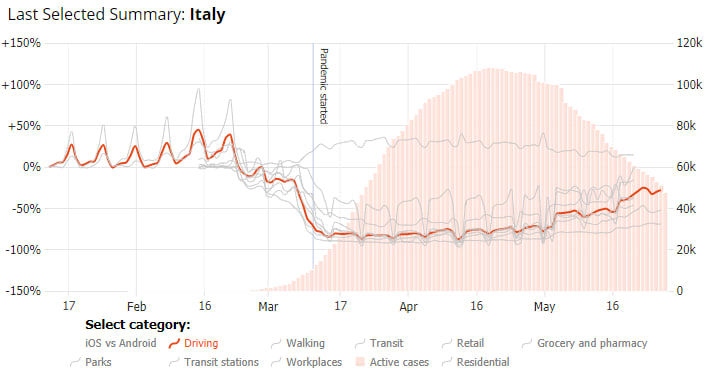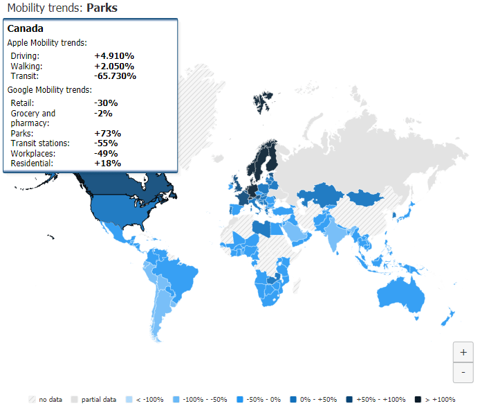 The Apple dataset includes categories for driving, walking and transit, while Google's data reports mobility changes in retail, grocery & pharmacy, parks, transit stations, work and residential locations. Both report daily data relative to a pre-COVID baseline. You can now see how driving increased or decreased as a result of mobility measures in various countries, how people stayed at home and away from work, or increased time spent in parks rather than retail establishments.