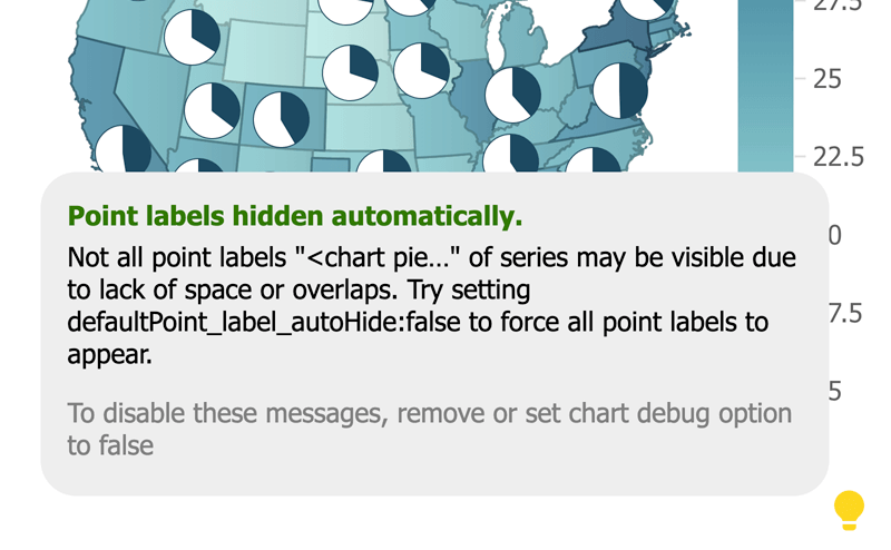 If the debug: true chart option is set, the chart will attempt to detect common chart issues and suggest solutions. When issues are detected, a light bulb icon will appear on the chart with suggestions when you hover it. This feature is in the early stages of getting built out—Look for more expansive issue coverage in upcoming releases.