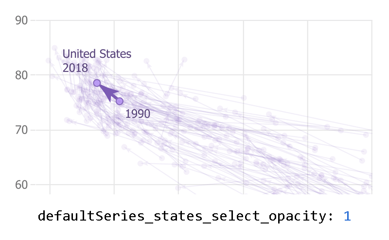 Some state settings have been simplified making it more convenient to control state visuals. For example this setting will apply the same opacity to the series line, and point markers when hovering a point: { defaultSeries_states_hover_opacity: .5 }
