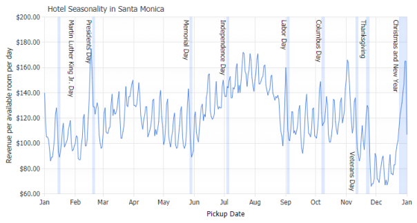 Holiday calendar pattern markers showing correlation with hotel traffic.