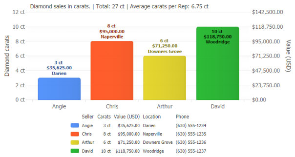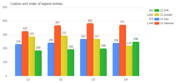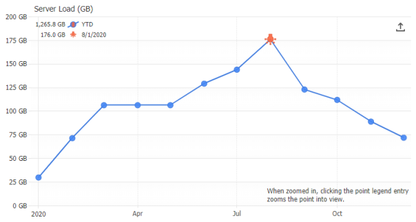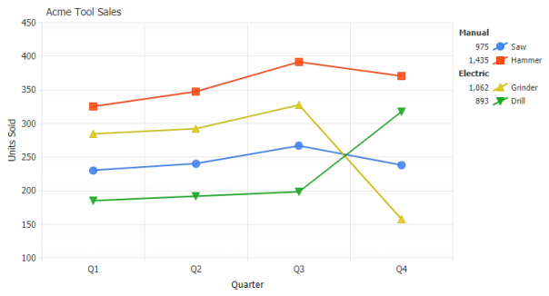 The legend can be positioned anywhere on the chart area and provides interactivity to turn individual series on or off. Using label tokens, legend entries can be easily customized to display general calculations related to their series.