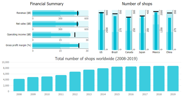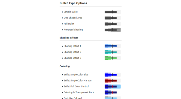 A bullet graph is a type of bar chart intended to replace dashboard progress bars and gauges. Compact and data dense, bullet charts provide value, target and category comparison ranges in a small data visualization.