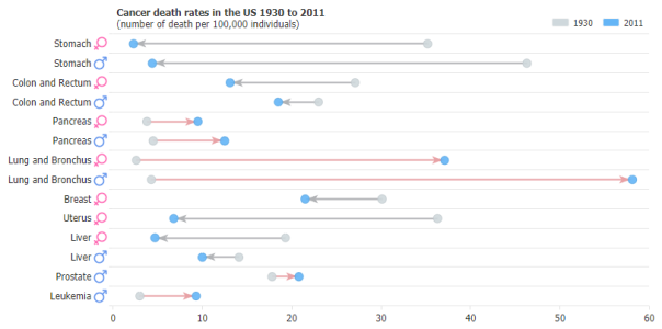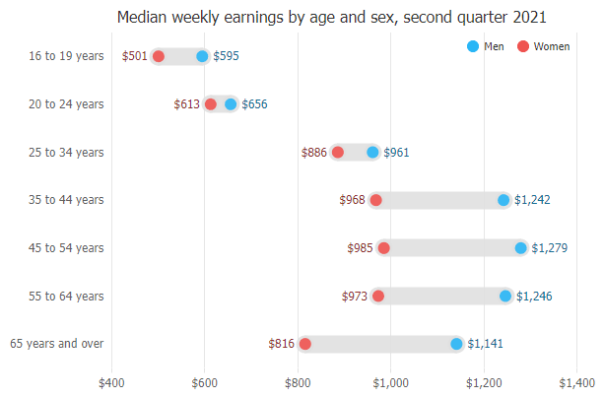 A dumbbell chart with capped line to compare data between men and women. Uses firstPoint and lastPoint to manage styling.