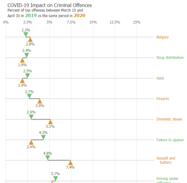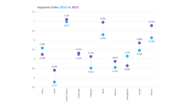 Dumbbell plot chart. Multiple line series with line caps to signify change over time.
