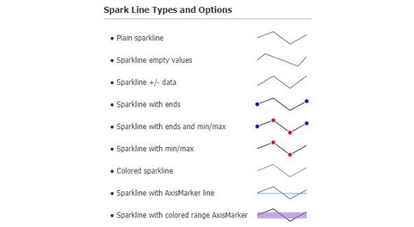 Micro charts and sparkline charts offer condensed data visualizations for many different chart types ideal for dashboard, table and grid chart integrations. Sparklines and micro charts typically disable axis and gridlines to aid smaller sizes charts for inline embedding.