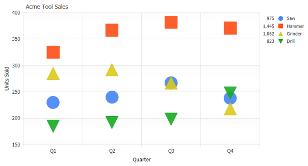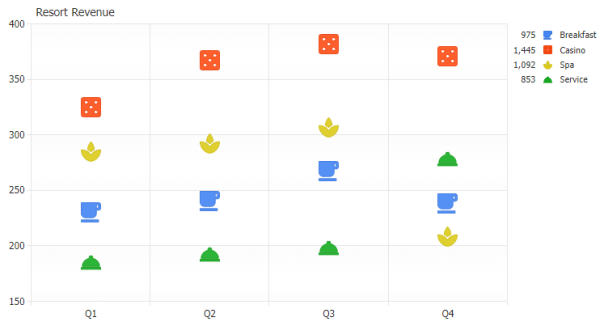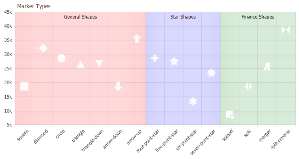 Supporting a variety of predefined vector marker styles for point, scatter and line charts along with customization for size, color and hover effects, JSCharting also enables customization through your own image based markers on a per point basis.