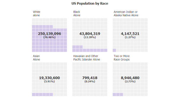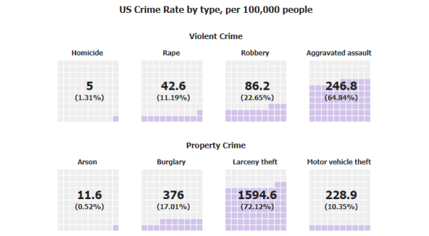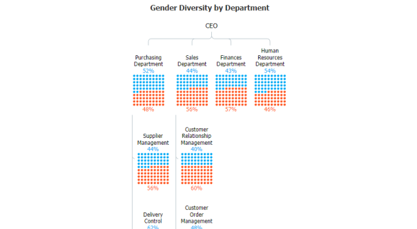 Waffle charts visualize completion percentage using a grid of colored cells or tiles. Functionally similar to a linear gauge, using a grid allows for glanceable comparisons. The more cells that are filled with color, the closer to your goal or 100% target. While gauges or pies can be difficult to quickly evaluate due to different axis scales and angled slices, Waffle charts allow for quick comparisons by glancing at equal areas for a given category.