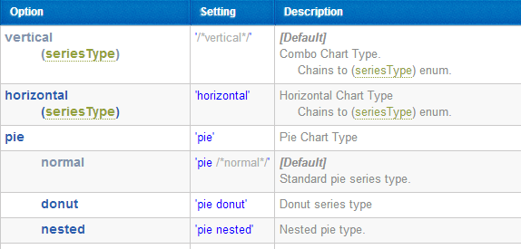 Enum settings are predefined text options. Enum chaining allows you to use multiple enum values chained together in a single setting. Each enum option determines the subsequent enum options that can be chained to it. This creates a tree of options and allows expressing settings that would have otherwise required multiple properties in an unchained format. For example the chart type property specifies the main chart type, but an associated default series type can be included (chained) to it in the same string setting. The goal of enum chaining is to reduce the amount of code necessary to specify complex chart types and options.